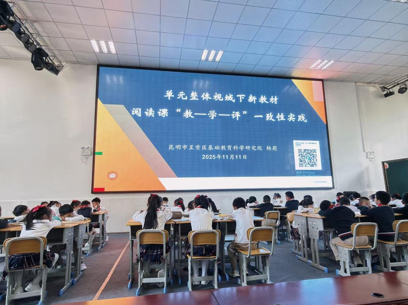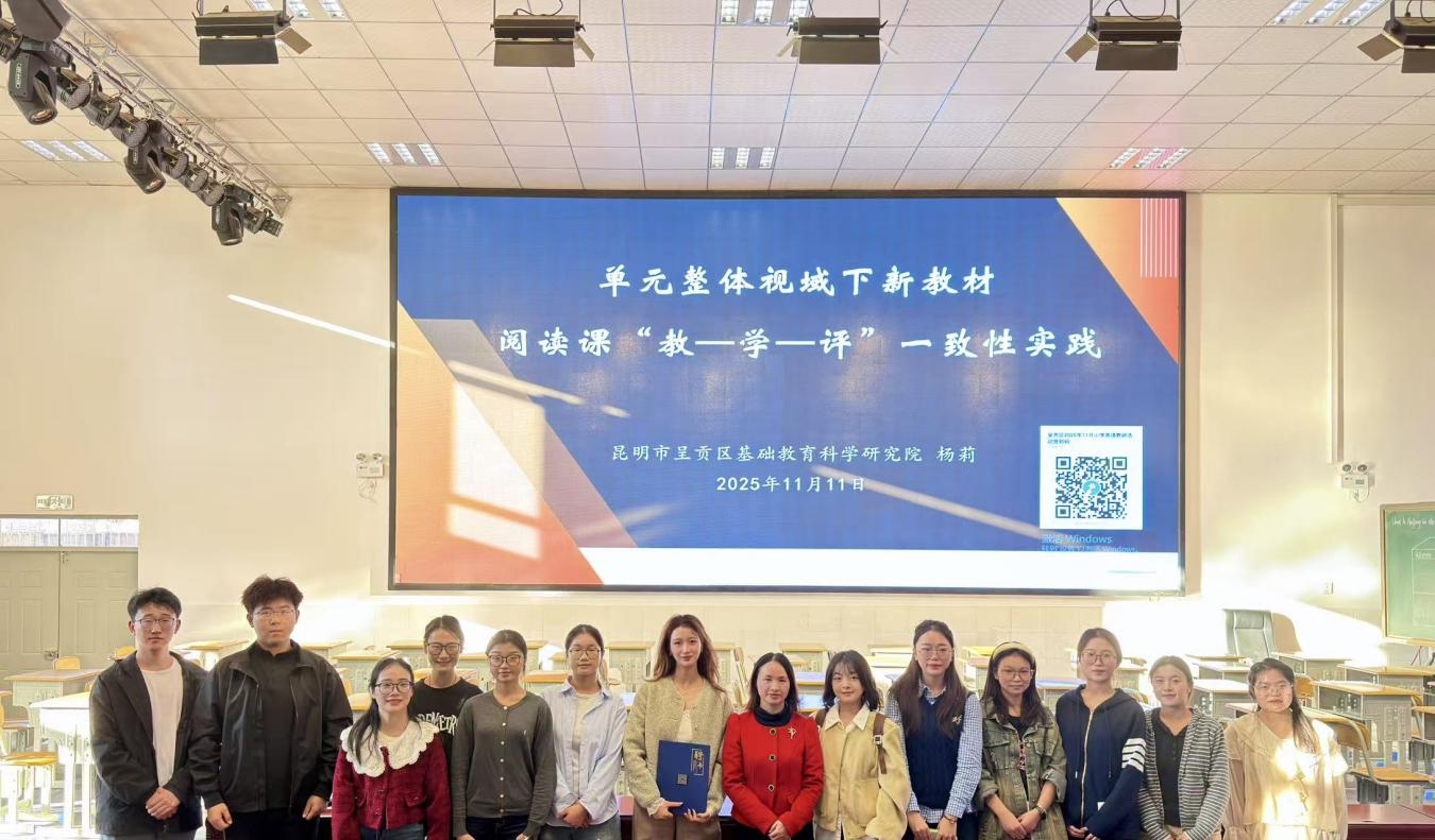 2025年11月11日,昆明传媒学院新视域产业学院与小学教育专业师生代表赴呈贡区第二小学,全程参与昆明市杨莉名师工作室主办的“单元整体视域下新教材阅读课‘教—学—评’一致性实践”区级英语教研活动。