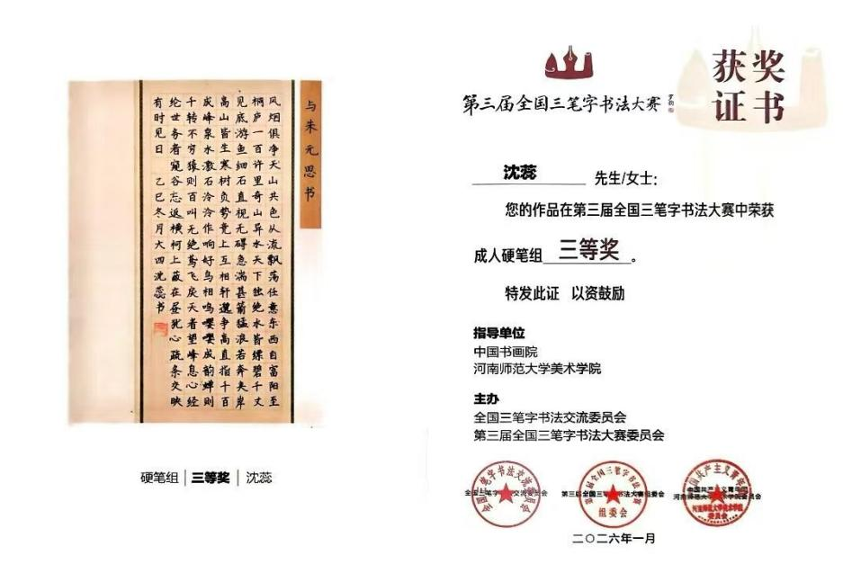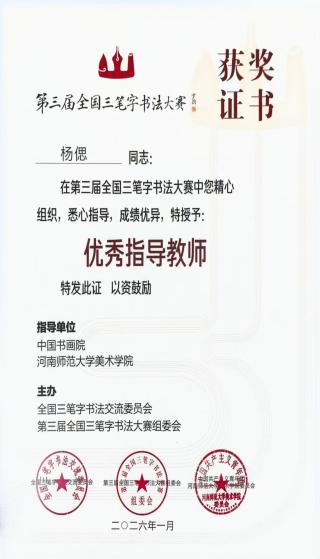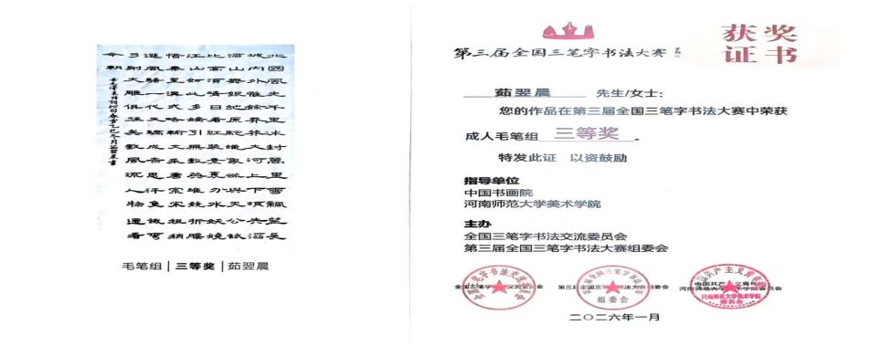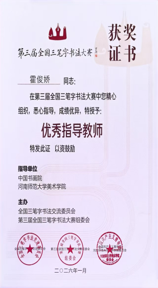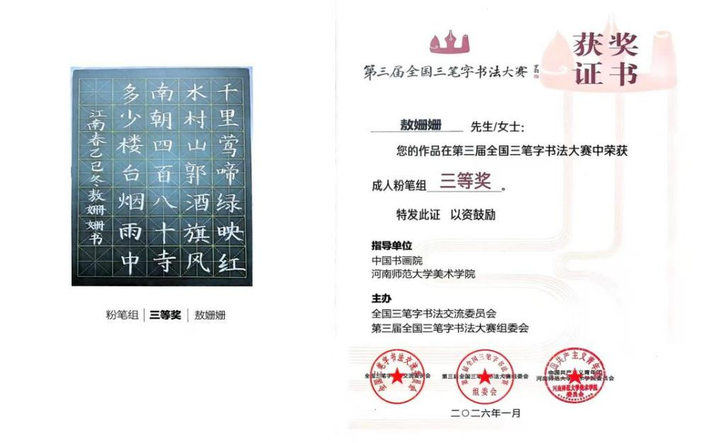 学院聚焦师范生教育实践核心能力培养,从黑板上的粉笔春秋,到案头的毛笔意韵,再到纸间的钢笔风骨,三笔字承载的不仅是书写技艺,更是师者对文化传承的担当。师范生的每一份作品都能以规范为骨、以情怀为魂,在横竖撇捺间彰显汉字之美,在笔墨晕染中传递育人初心。此次多幅书写作品在行业全国性比赛脱颖而出,既是学子潜心研习、精益求精的书写成果,更是学院坚持应用型、复合型美育人才培养目标的生动体现。